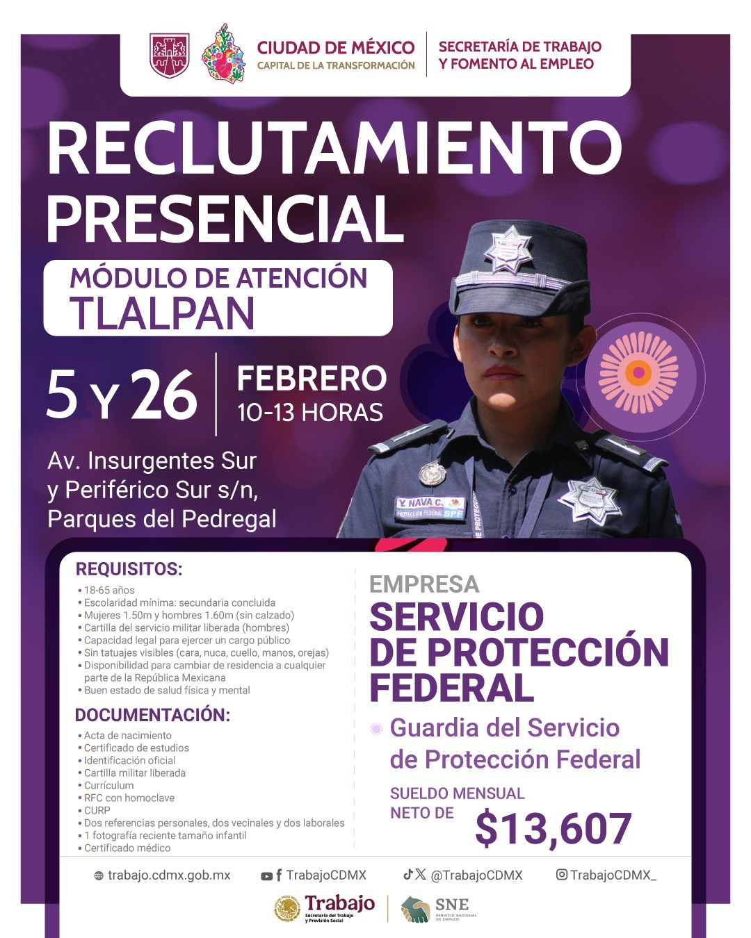 Participa en el reclutamiento presencial para el Servicio de Protección Federal en el Módulo de Atención Tlalpan, ubicado en calle Periférico Sur e Insurgentes Sur s/n, Parques del Pedregal (al inteior del Deportivo Villa Olímpica).