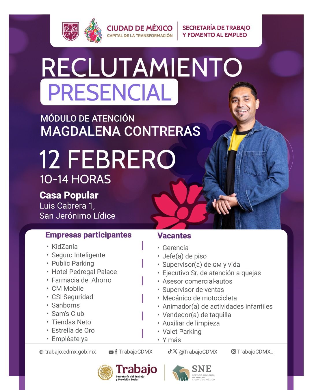Participa en el reclutamiento presencial en el Módulo de Atención en la alcaldía La Magdalena Contreras ubicado en Avenida Luis Cabrera 1, San Jerónimo Lídice.