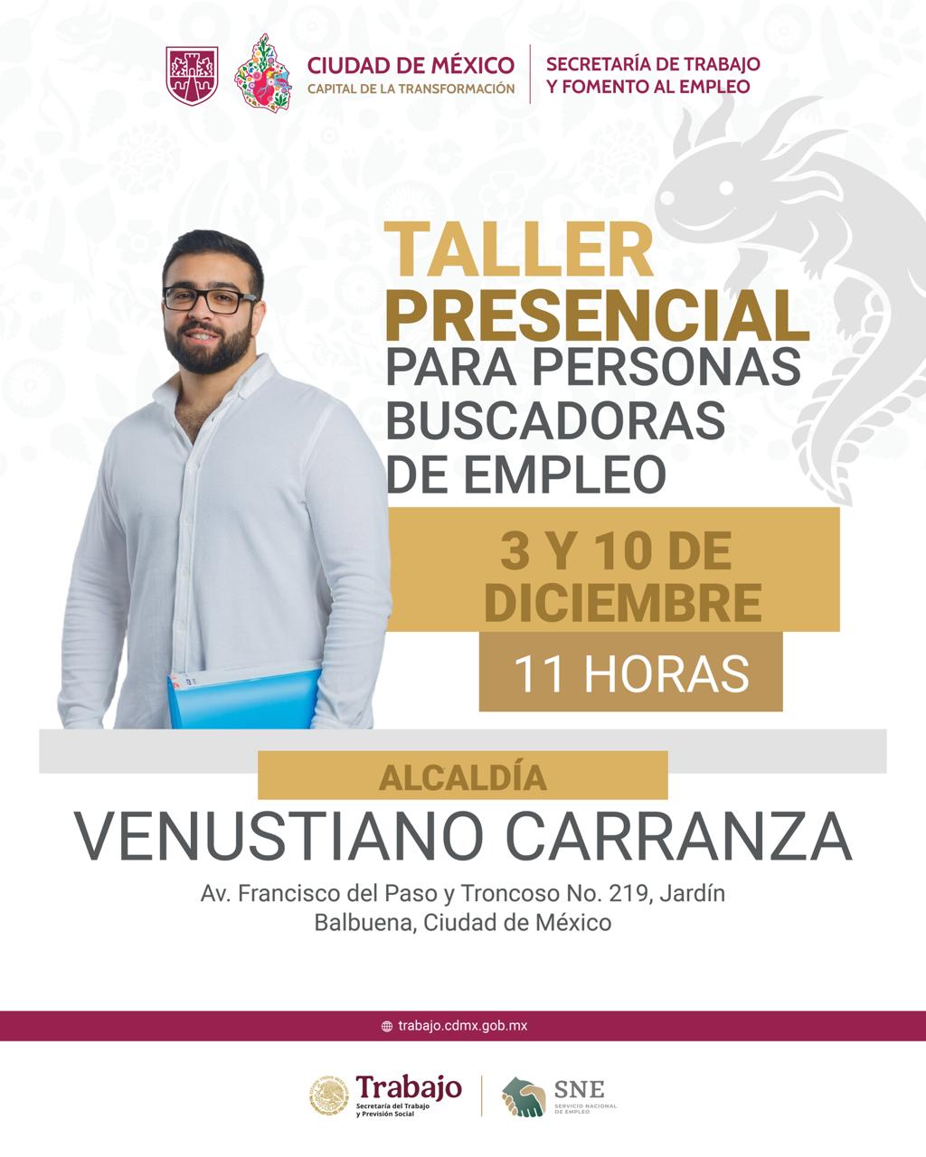 Participa en los talleres presenciales para personas buscadoras de empleo en el Módulo de Atención #VenustianoCarranza, ubicado en Francisco del Paso y Troncoso 219, Jardín Balbuena.