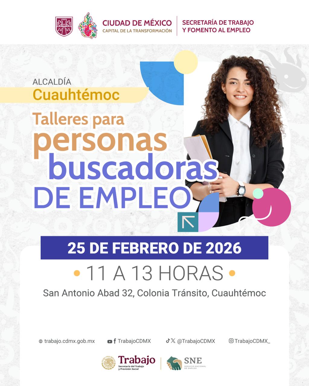 Participa en los talleres presenciales para personas buscadoras de empleo en el Módulos de Atención ubicado en Calzada San Antonio Abad 32, 1er piso, colonia Tránsito.